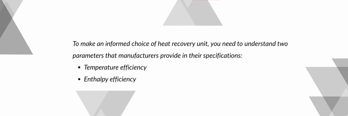 - Enthalpy efficiency – this parameter applies exclusively to units with enthalpy heat exchangers. It describes the system’s ability to recover total energy – i.e. both sensible heat and latent heat, which is the energy stored in water vapour.